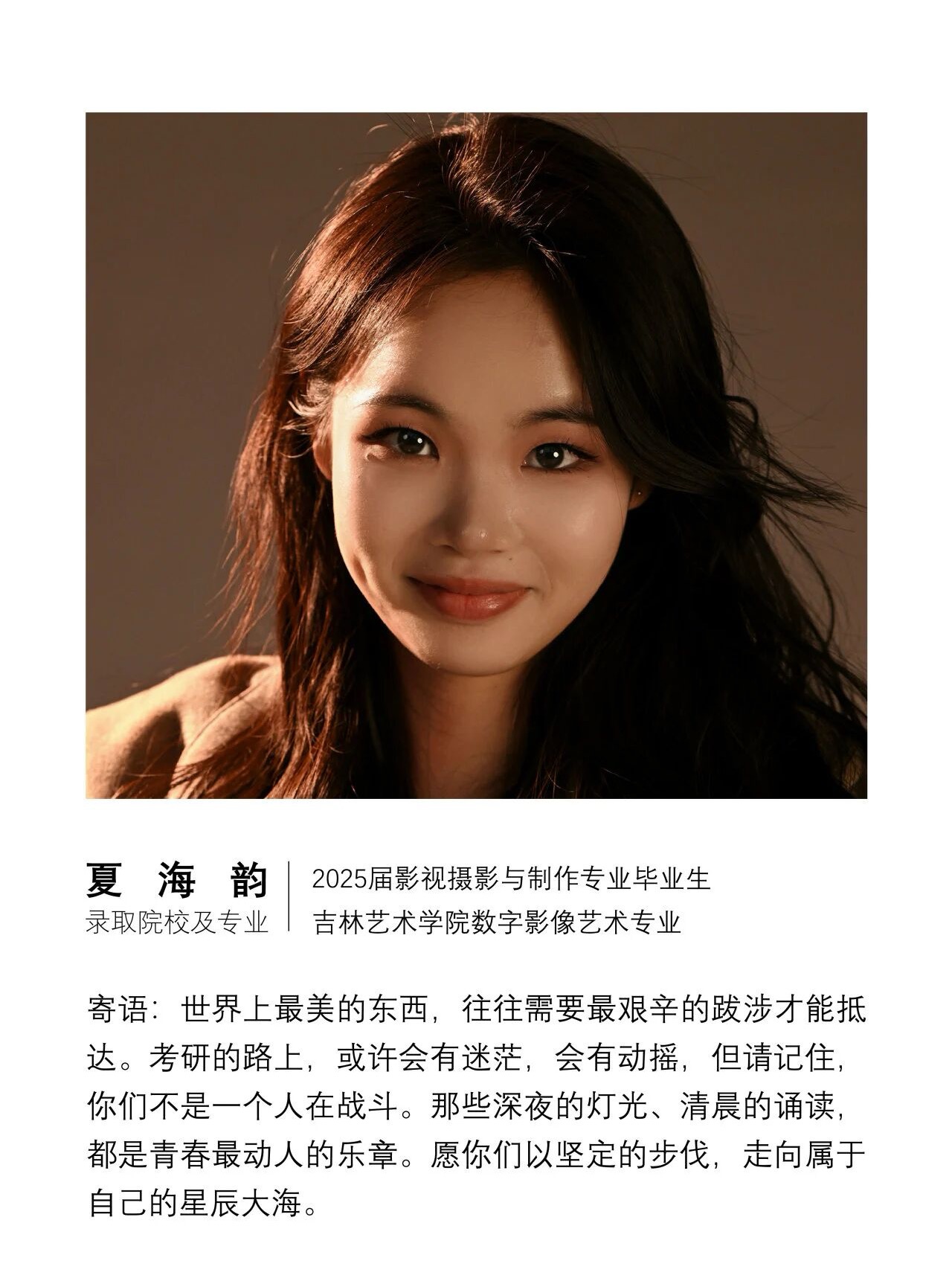 电影学院 || 夏海韵——2025届影视摄影与制作专业优秀毕业生,考取吉林艺术学院数字影像艺术专业硕士研究生。